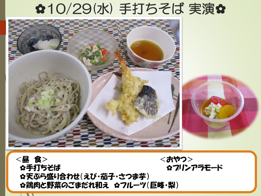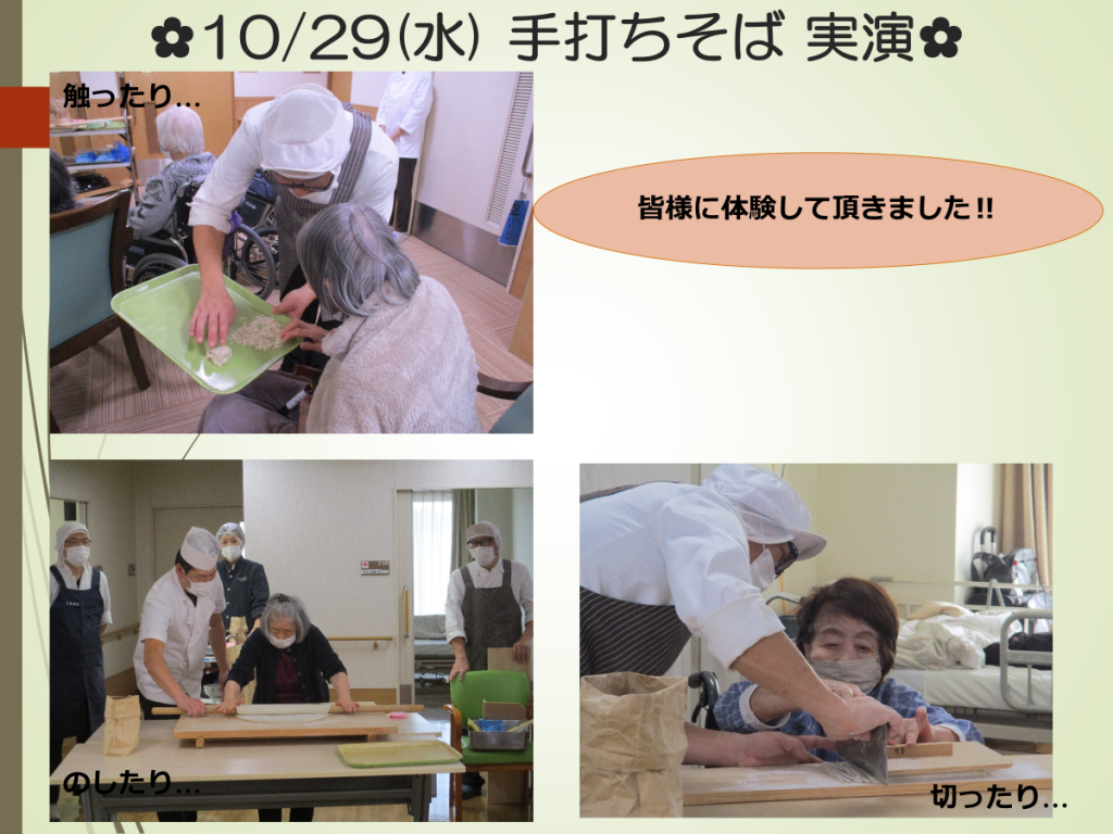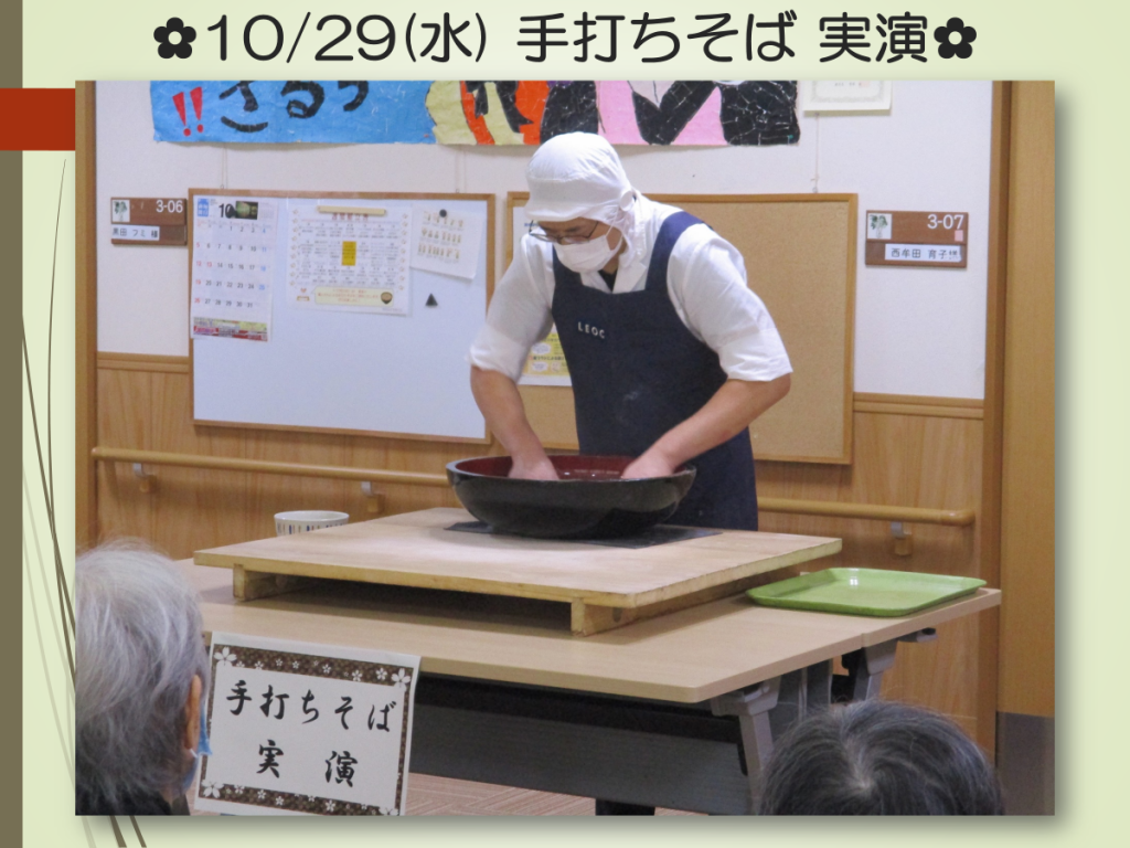 9月の「手打ちうどん」に続き、10月は「手打ちそば」を行いました。利用者様皆さま、職人さんの説明を真剣に聞き、質問されたり、ご自身の経験を話されたりする方もいらっしゃいました。普段なかなかできない体験をすることが出来ました。