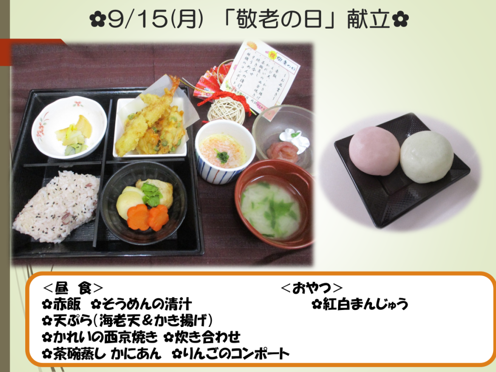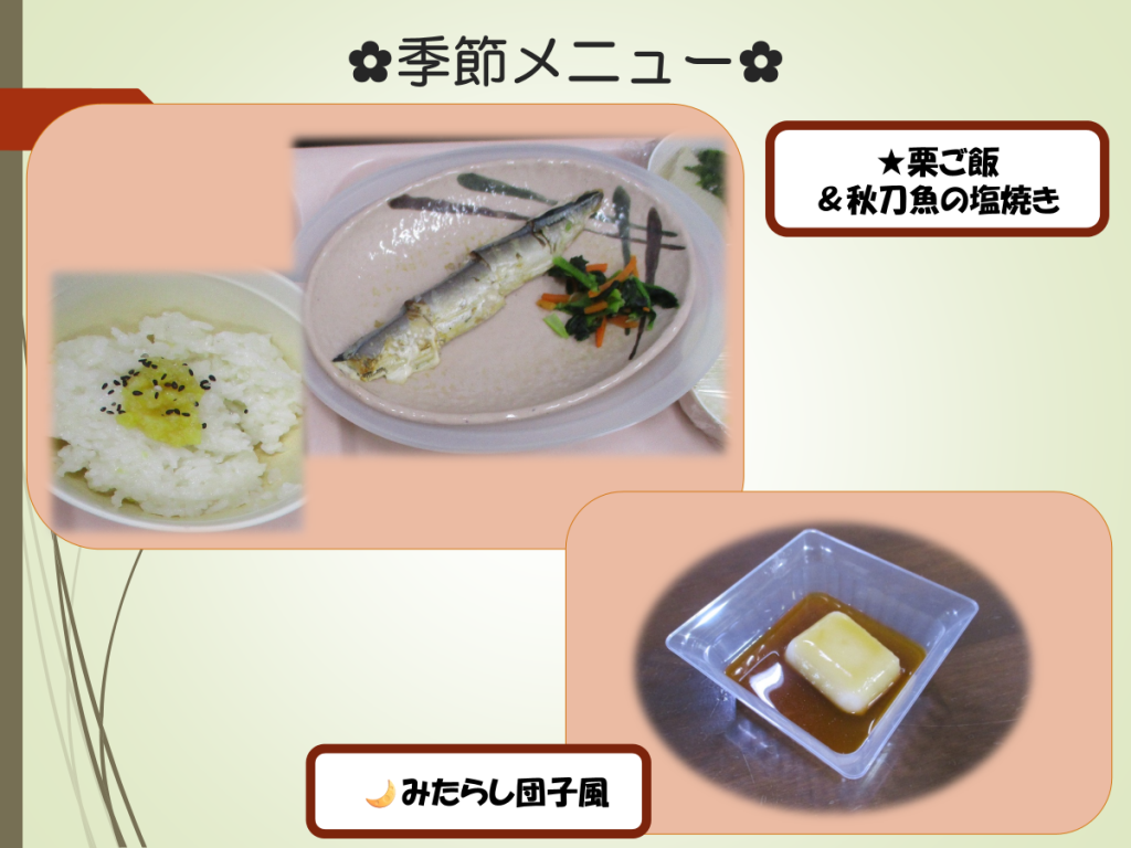 まだまだ暑い日が続いていますが、栗やさんまなど秋の訪れを感じられるような食材をご提供いたしました。 10月の献立もお楽しみ下さい‼