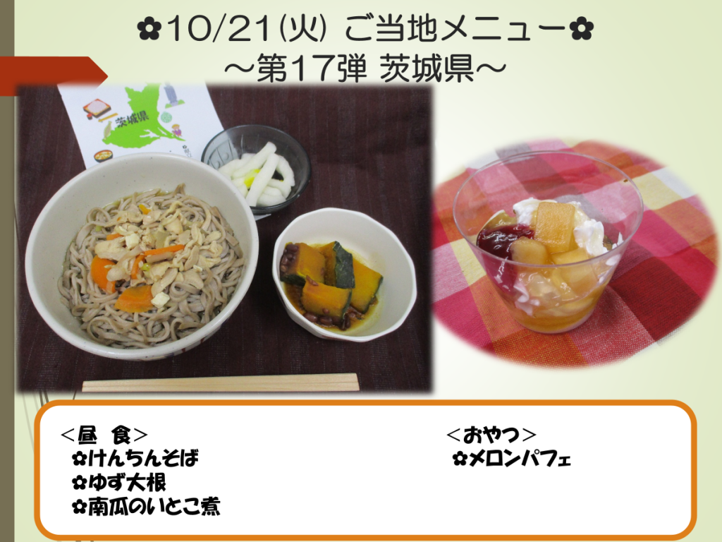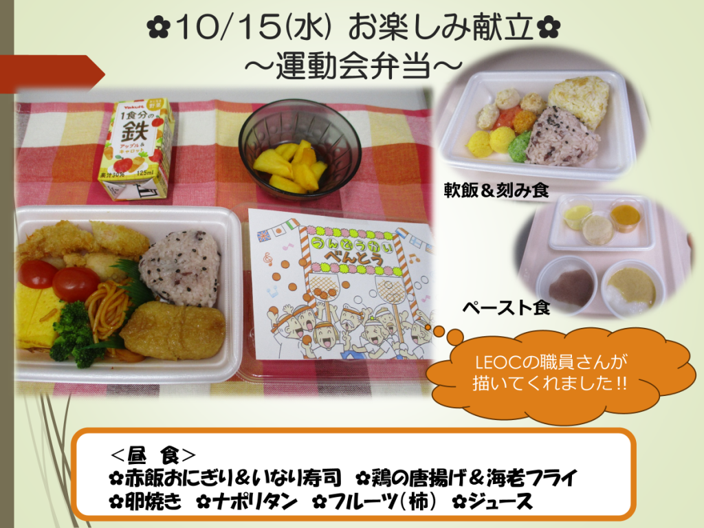 10月のお楽しみ献立は、“運動会”シーズンということで、お弁当を提供致しました。各フロアでは、実際に運動会が開催され、「お弁当を食べて、頑張ります!」というお声を頂きました。刻み食やペースト食の方の盛り付けもLEOCさんが工夫して頂き、彩り良く仕上がりました 。11月楽しみにしていてください。